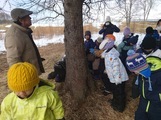 2月18日(水)、1年生が生活科「冬となかよし」の活動で、学校支援ボランティアの方を講師に活動しました。湿原センターやネイパルでの経験のある自然観察のスペシャリストですので、子供たちもノリノリで探検を楽しみました。エゾシカの足跡や、木の樹皮の観察など、冬ならではの学習活動ができました。