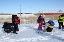 1月28日(金)、散布小学校3・4年生6人が琵琶瀬川の周辺で歩くスキーを行い、動物の足跡や双眼鏡を使って野鳥の観察を行いました。