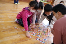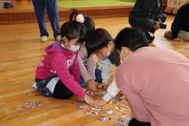 この日は、「幼年消防クラブの活動は今日で最後になりますが、楽しんでください」という消防士さんの言葉に始まり、子どもたちは3つのグループに分かれ、女性消防団員が読み上げる句を集中して聞きながら、真剣に取り組みました。かるたでは、なかなか取れなくて悔しがってしまうこともありましたが、すべての札を取るまで頑張りました。