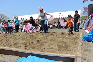 会場内に設置した砂場で行われた潮干狩りゲームでは、牡蠣やツブ、あさりなど、合図とともに競い合って掘っていました。