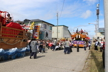 霧多布市街を練り歩く各地域の自慢の山車には、たくさんの若者たちがあふれ、パワー全開で太鼓をたたいていました。