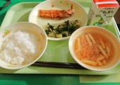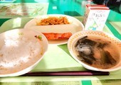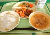 今日の給食は、「ごはん」「みそ汁」「ザンギ」「ナムル」「牛乳」です。みんな大好きなザンギ。子どもたちはとても喜んで食べていました。