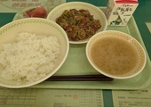 今日のは、「ホイコーロー丼」「みそ汁」「りんご」「牛乳」でした。ホイコーロー丼はホイコーローをご飯に載せて食べます。味も濃い目で、丼物として食が進みます。ボリュームもあって大満足です。
