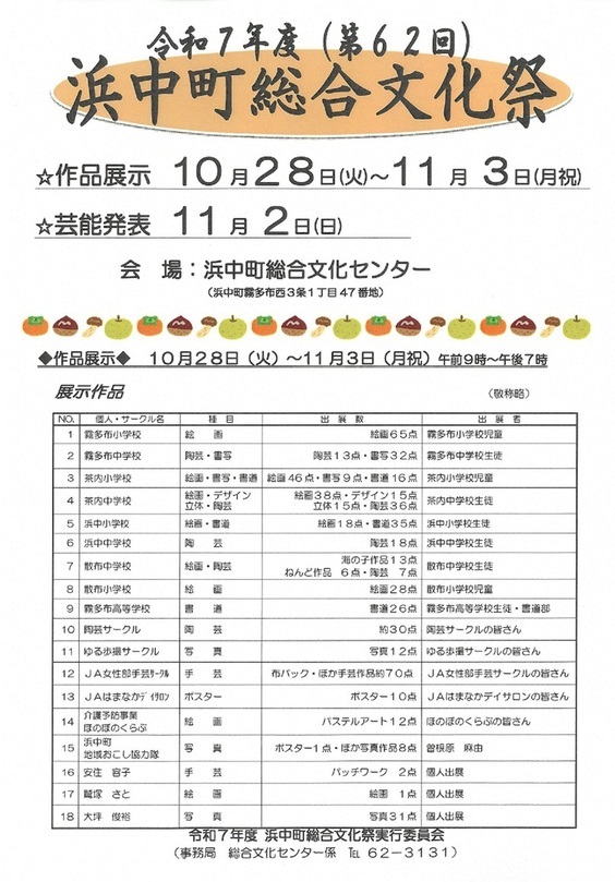 浜中町総合文化祭は、11月3日の「文化の日」を記念して町民の皆さんが日ごろ行っている文化・芸術の活動の成果を発表すること、伝統文化を継承し道東に根ざした新しい文化活動の創造を図ることを目的に開催され、今年で62回目を数えます。