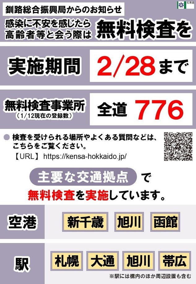 また、取り組みに伴い、PCRおよび抗原の無料検査期間が2月28日まで延長されます。自身の体調や感染リスクの高い人との接触に不安を感じたら、下のチラシにより検査実施場所を確認のうえ、無料検査をご利用ください。
